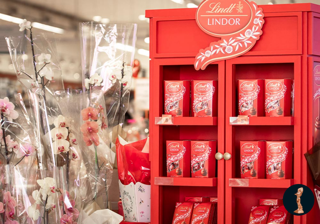 Recebemos o desafio de criar um display de chão para o Dia das Mães que promovesse o cross entre chocolates Lindt e flores em supermercados. A solução foi um display que remetia a uma cristaleira da Lindt, com chocolates na parte superior e flores expostas na base e laterais. O móvel, feito em MDF, contava com prateleiras salientes para facilitar a pega dos chocolates, enquanto a parte inferior, com rodízios e prateleiras em chapa metálica, suportava água, flores de corte, orquídeas e vasos. Painéis de comunicação intercambiáveis destacavam a campanha.